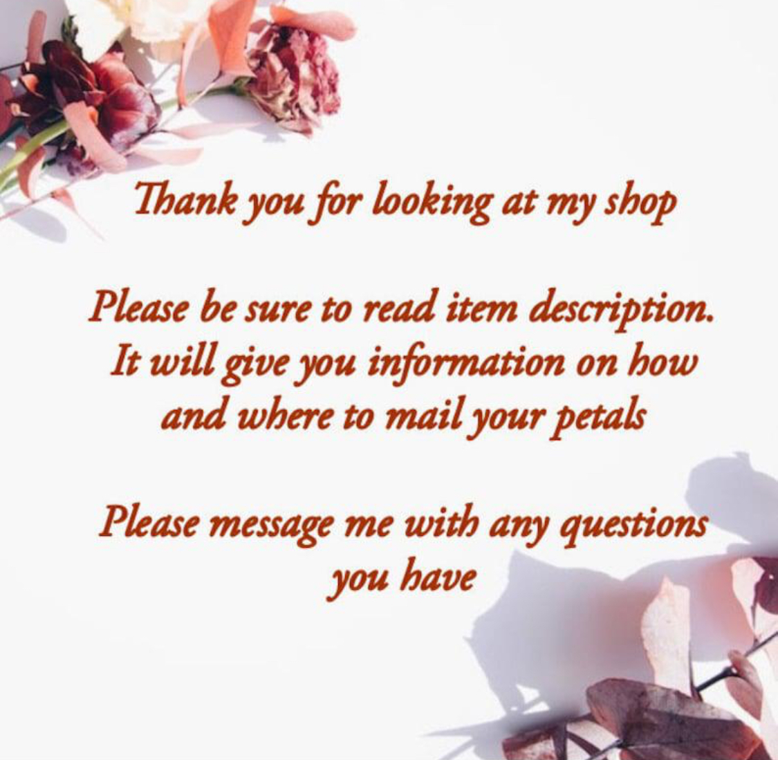 Once you place your order, please go to this link and print form to send with your petals to make sure that your petals will match up with your order when you mail them. Thank you for supporting my small business.